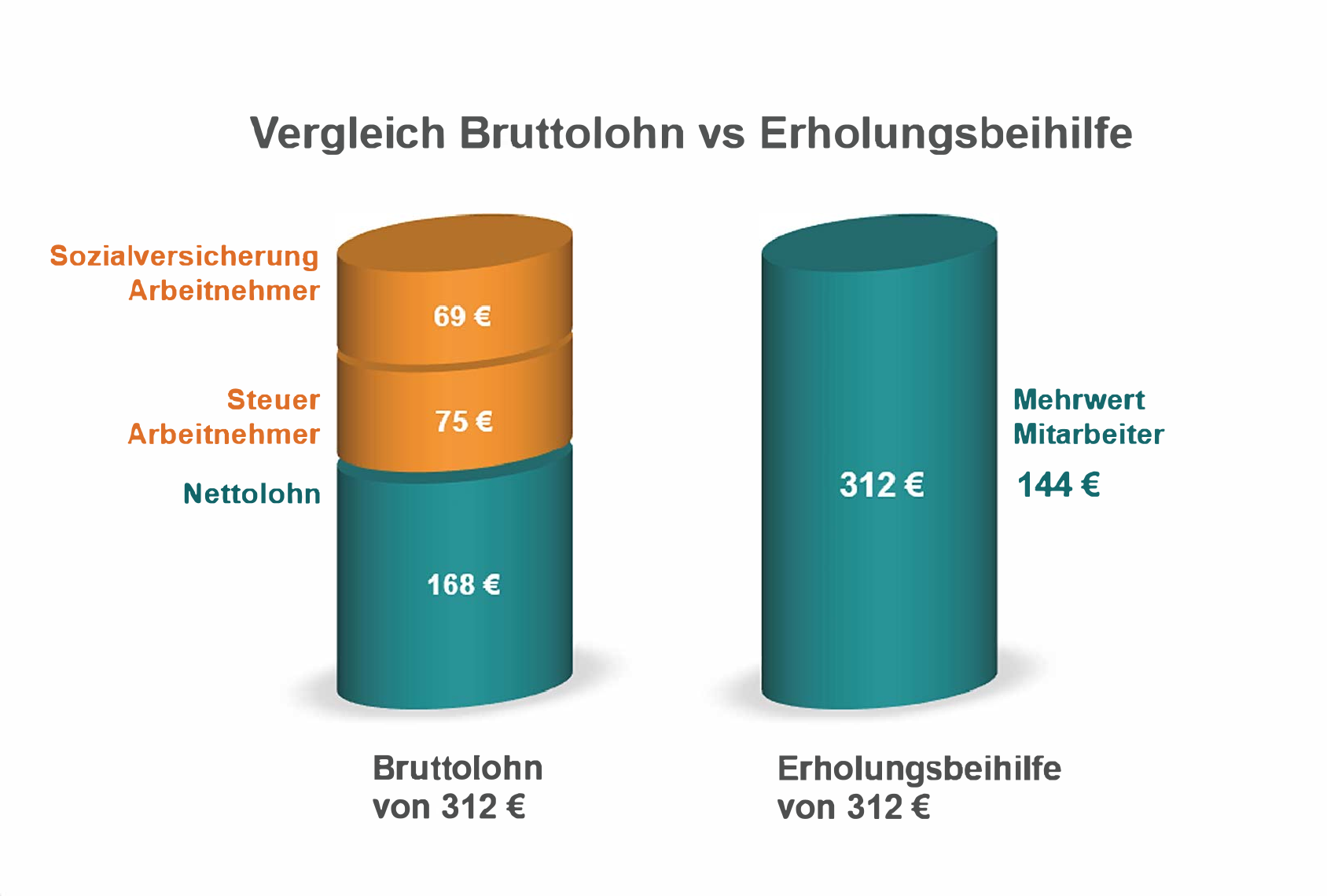 Die Erholungsbeihilfe zahlt der Arbeitgeber seinen Mitarbeitern um die Leistungsfähigkeit zu erhalten, indem der Mitarbeiter sich ausreichend erholen kann. Dazu kann der Arbeitgeber sowohl dem Mitarbeiter als auch dessen Ehegatten und Kindern einen Zuschuss zur Erholung zahlen. Dieser Zuschuss wird vom Arbeitgeber pauschal versteuert, ist aber für den Mitarbeiter komplett steuer- und sozialversicherungsfrei.